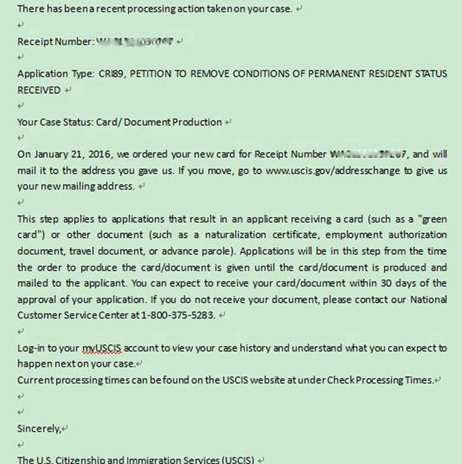 2016年1月21日, 客户刘先生(化名)收到了移民局发来的获批I-829邮件。 最近喜事连连,客户获批消息相继传来。刘先生得知I-829获批的消息后,第一时间向 分享了这一喜讯,并向 移民顾问团队表示衷心的感谢!