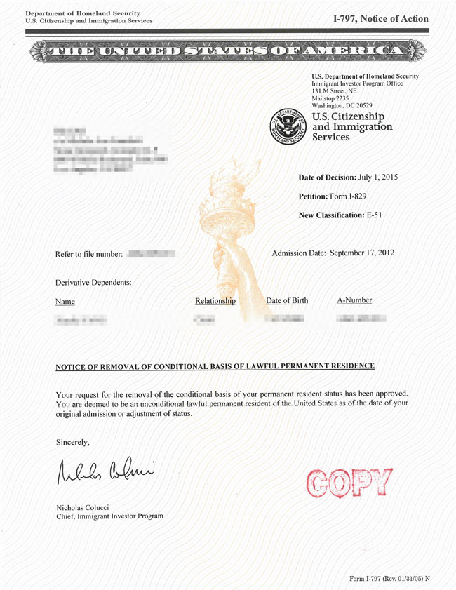 接到客户方女士(化名)的好消息,她已经获批美国投资移民的永久绿卡,顺利解除两年绿卡的限制条件。真是可喜可贺啊!方女士成功获得美国永久绿卡,也表明了其实移民美国并没有那么难。只要有移民的梦想, 一定竭尽全力帮您实现。真心恭喜方女士梦想成真!