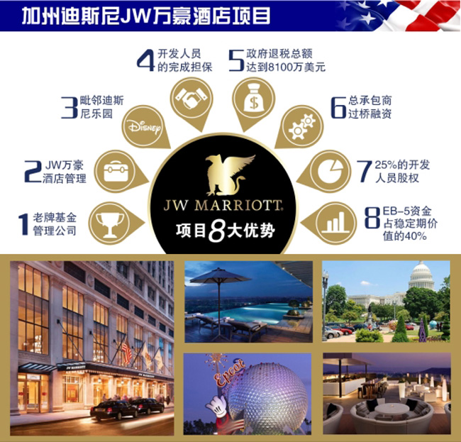 今年9.30大限过后,EB-5将再次面临涨价危机。有意向的投资者,还是尽快递交申请为宜。在 移民专家的一致认可下,向广大客户推出EB-5投资又一力作——加州迪斯尼JW万豪酒店项目。预计2016年第一季度开始施工,建成后将会成为一个拥有466间高档客房的12层5星级奢华酒店。加州迪斯尼JW万豪酒店项目拥有5大主要亮点:1.开发商及资金有保障;2.资深建设团队加持;3.黄金地理位置;4.当地政府大力支持;5.创造超高就业机会。正是看中它的投资潜力与发展前景,加州迪斯尼JW万豪酒店将成为 重点推介的EB-5投资项目。
