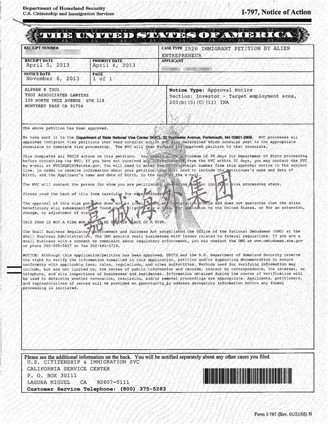I-526获批时间——2013年11月6日