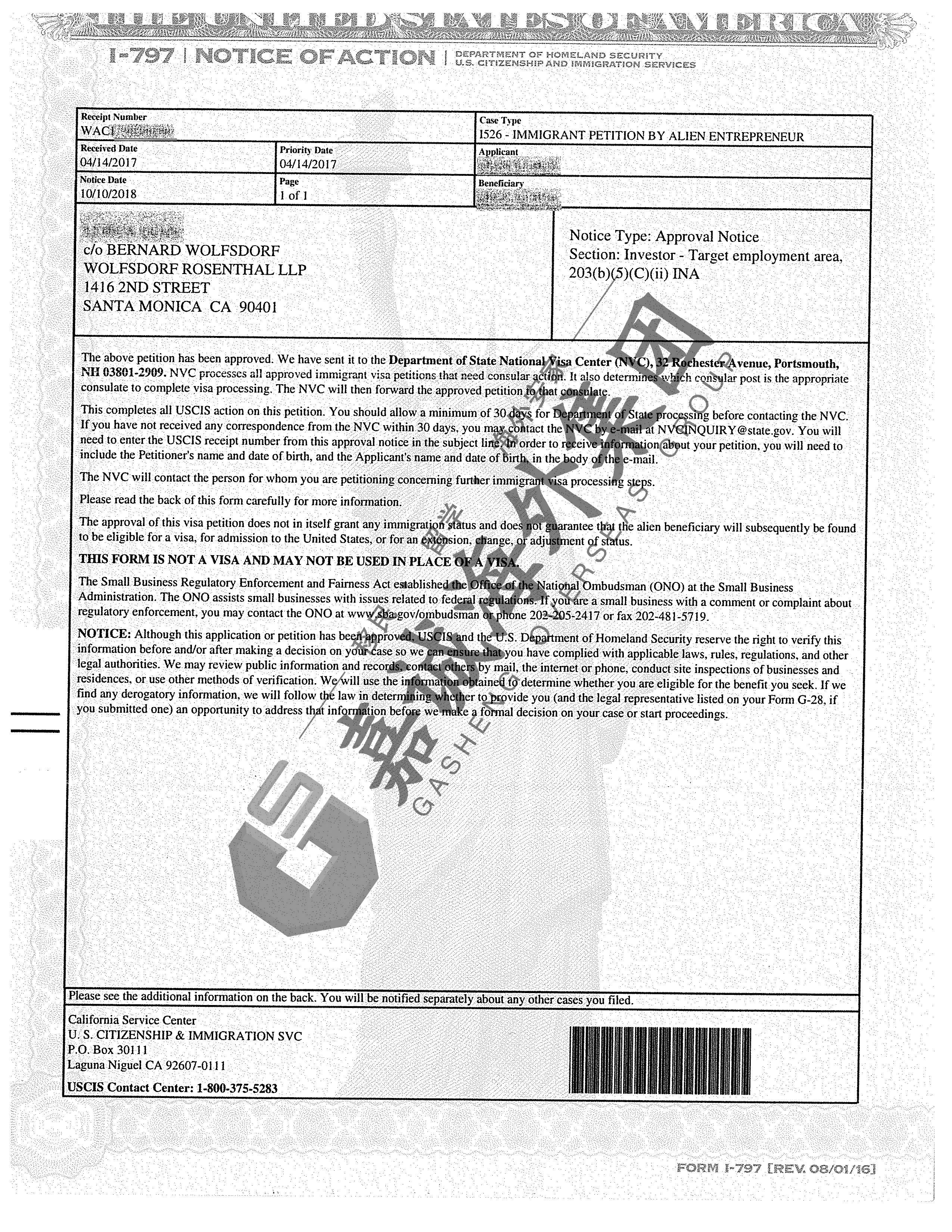 皇天不负有心人,专业的文案材料加上优质的投资项目,让客户顺利迎来了移民局的批准。在这里恭喜何太太!接下来, 的专业移民团队将一如既往,继续帮助客户严格把关后续事项,以确保何太太一家顺利拿到签证,早日登陆美国。