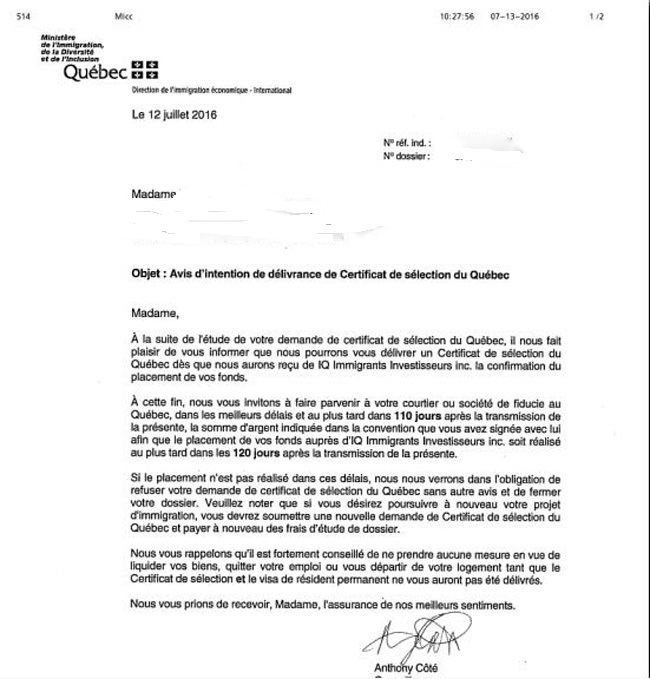 2015年3月份 向魁省移民局递交移民申请