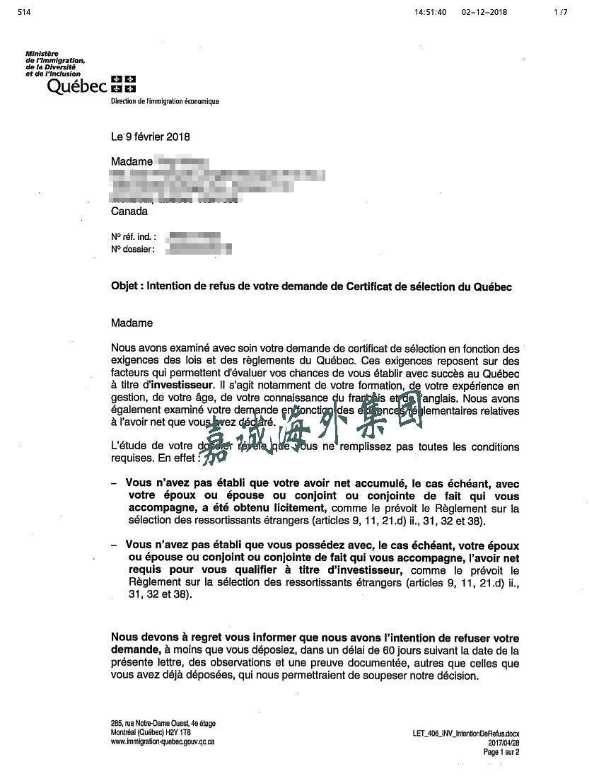文案顾问帮何女士准备了完整的材料,并在2017年1月向移民局递交。但是,今年2月份的时候,却收到移民局的意向拒签信。