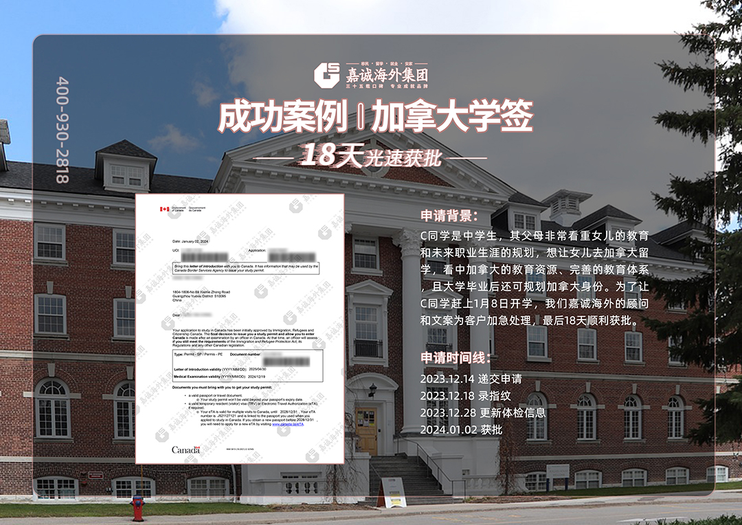 C同学是中学生,其父母非常看重女儿的教育和未来职业生涯的规划,想让女儿去加拿大留学,看中加拿大的教育资源、完善的教育体系,且大学毕业后还可规划加拿大身份。为了让C同学赶上1月8日开学,我们 的顾问和文案为客户加急处理,最后18天顺利获批。
