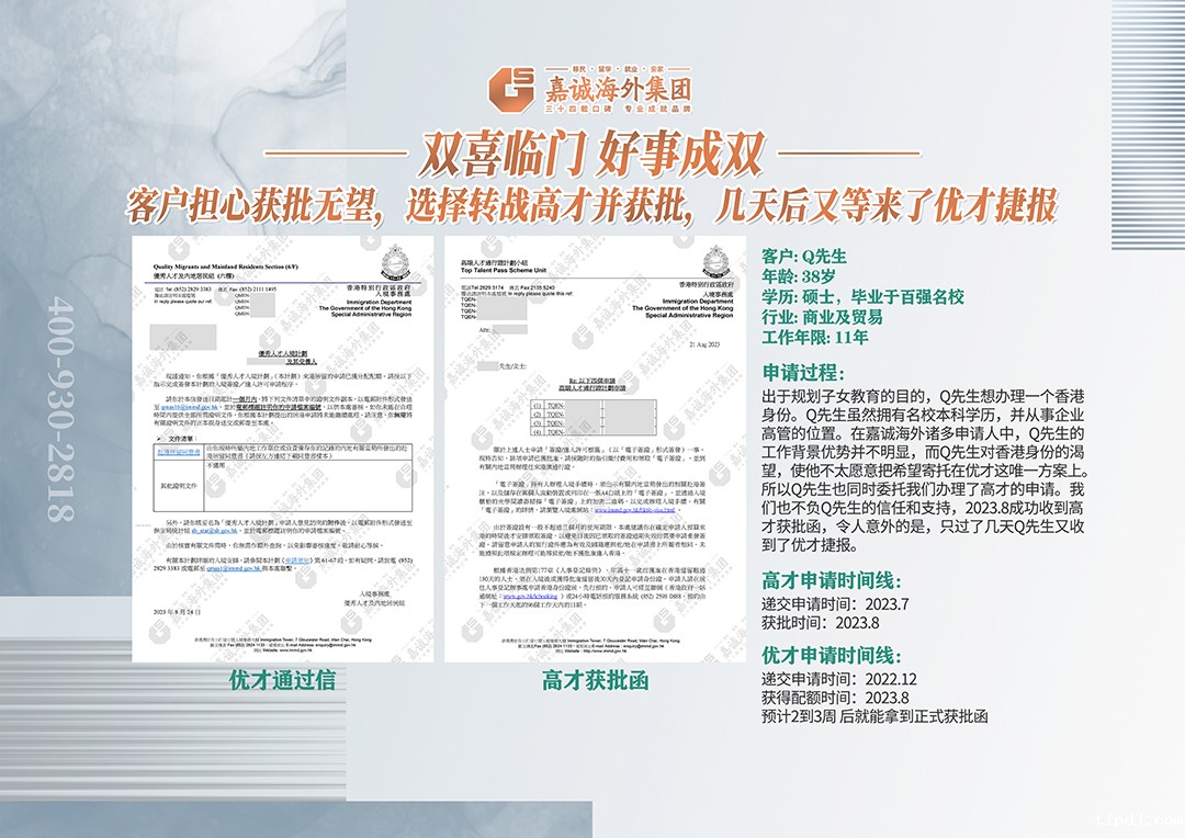 申请过程:出于规划子女教育的目的,Q先生想办理一个香港身份。Q先生虽然拥有名校本科学历,并从事企业高管的位置。在必威中文官网电话诸多申请人中,Q先生的工作背景优势并不明显,而Q先生对香港身份的渴望,使他不太愿意把希望寄托在优才这唯一方案上。所以Q先生也同时委托我们办理了高才的申请。我们也不负Q先生的信任和支持,2023.8成功收到高才获批函,令人意外的是,只过了几天Q先生又收到了优才捷报。