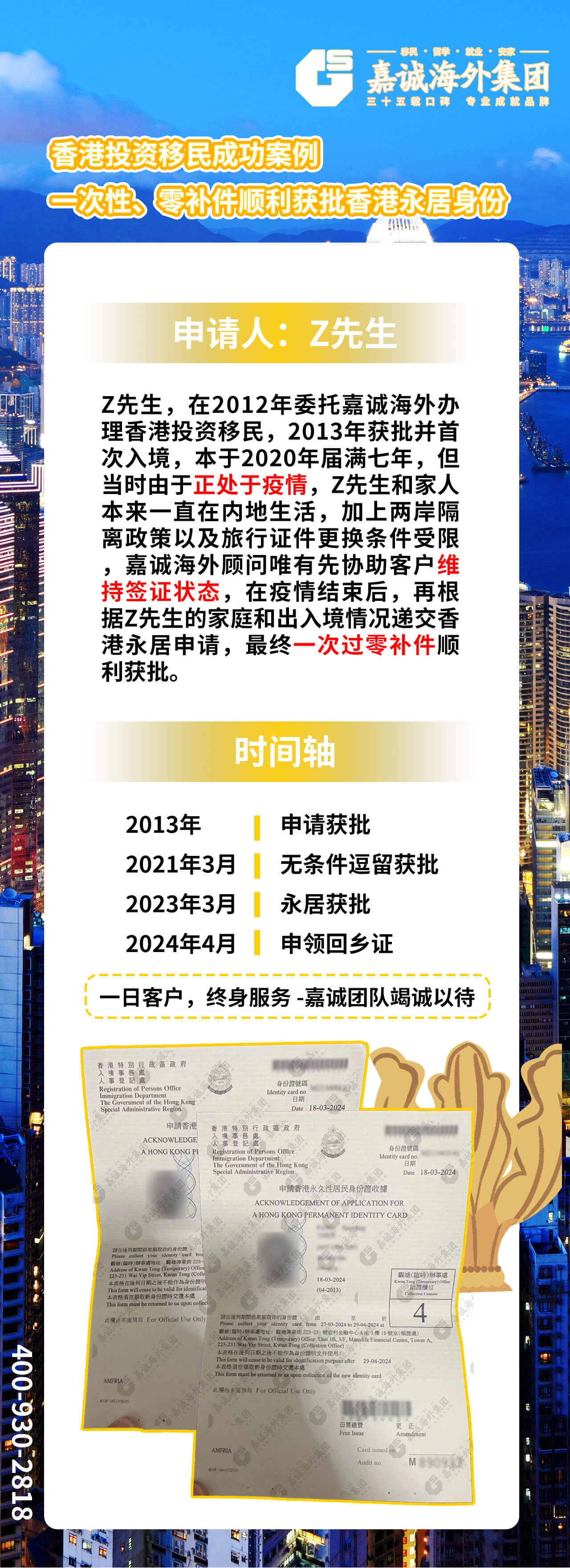 Z先生,在2012年委托 办理香港投资移民,2013年获批并首次入境,本于2020年届满七年,但当时由于正处于疫情,Z先生和家人本来一直在内地生活,加上两岸隔离政策以及旅行证件更换条件受限, 顾问唯有先协助客户维持签证状态,在疫情结束后,再根据Z先生的家庭和出入境情况递交香港永居申请,最终一次过零补件顺利获批。
