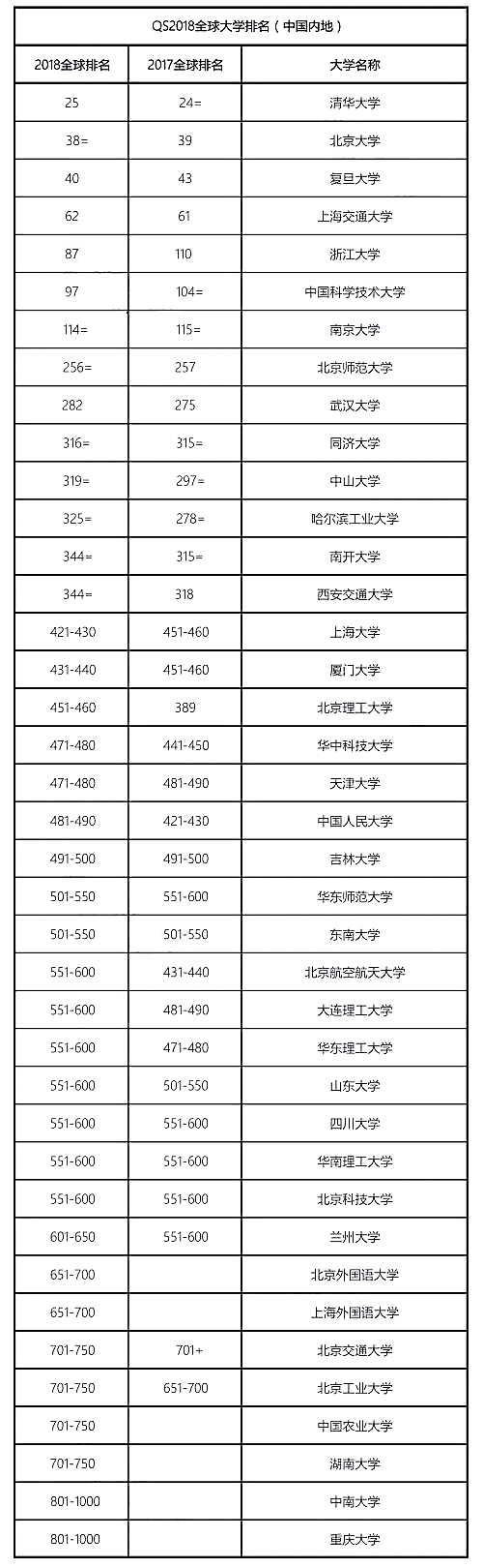 令大家惊讶的是,中国各大学在今年的QS排名中表现十分不错,63所高校上榜,内地6所大学加上港澳台6所大学进入世界前百强。清华大学稳居全球第25(去年24位);北京大学为全球第38(去年39位);复旦为全球第40位(去年43位);上海交大62位(去年61位);浙江大学进入百强升至全球第87位(去年110位);中国科技大学97位(去年104位)。