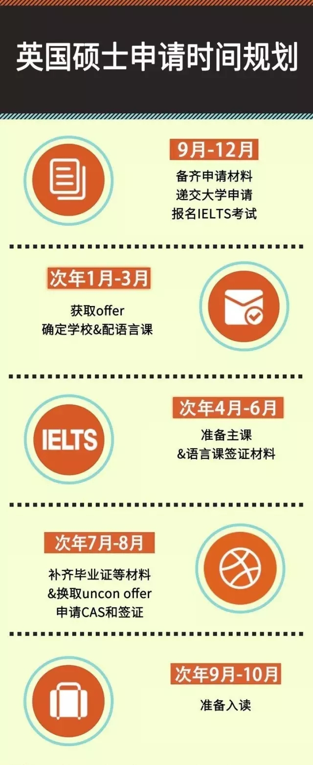 我们可以从图表中看到,今年12月起,我们就要开始准备申请材料和递交申请了,同时也要开始着手准备雅思,当然雅思越早准备越好,因为谁也不能肯定一次就考出理想成绩。