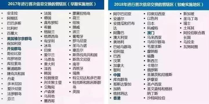 2018年9月,在这个时间节点上,涉税信息交换将彻底收网:中国个人及其控制的公司在下列40个国家和地区开设的银行账户信息将会主动呈报于中国税务机关: