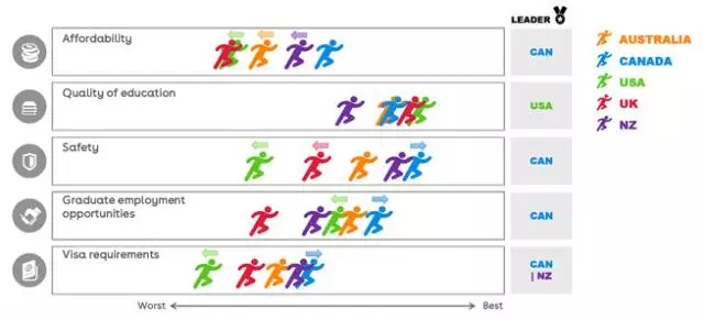 同样,最新学生消费行为调查突显了,从经济承受能力,安全性,就业机会和签证要求方面,学生对最具吸引力的目的地认知上显著的转向了加拿大。