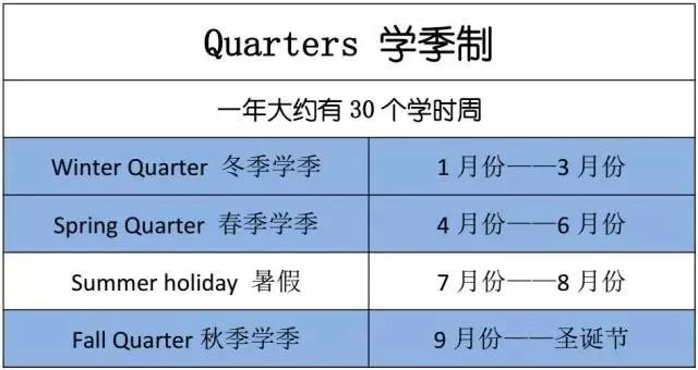 学季制。将学习时间分为三个学季:第一个学季一般是从9月中旬到12月上旬,称为秋季;第二个学季一般是从1月到3月,称为冬季;第三个学季一般是从4月上旬到6月中旬,称为春季;剩下的暑季是假期。采用学季制的美国学校相对较少。