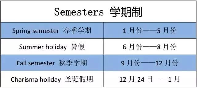 学期制。类似于国内的上、下学期,既是将一年的学习时间分为两个学期。第一个学期通常是从8月中下旬到12月中下旬,称为秋季学期;第二个学期则是从1月到5月中旬,称为春季学期。大部分的美国大学都会采用这种制度。