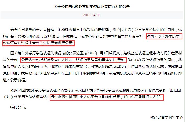 据中国侨网消息,4月8日,中国教育部留学服务中心发布公告称:中心从即日起在中国留学网开设专栏,对国(境)外学历学位认证申请过程中查处的失信行为进行公示。
