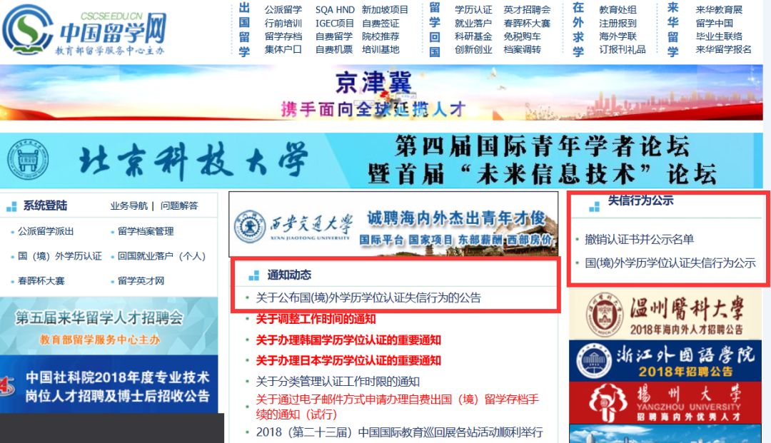 我们登陆中国留学网官网,发现确如公告所言,在网站首屏右页位置,出现了全新、醒目的失信行为公示板块: