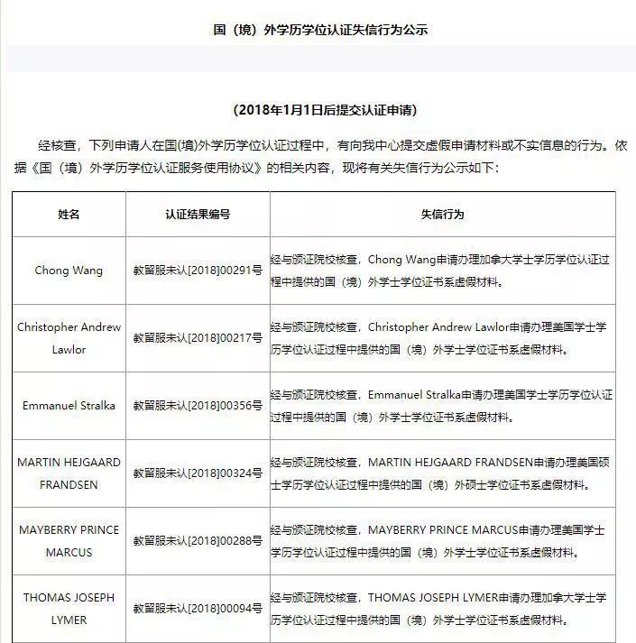 除此以外,留学服务中心还公布了72位申请人在国(境)外学历学位认证过程中提交虚假申请材料或不实信息的行为。