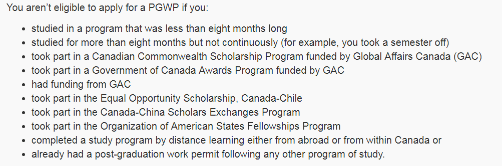 *项目长度少于八个月;*特别注意:就读时间超过八个月但是不连续,曾经中断过(关于连续的定义,移民局给出了例子:休学一个学期,也会被算作没有连续读书。也就是说,除了Summer Term休息以外,Winter和Fall这两个学期都必须在读书,才算是有连续完成学业。);*参与了加拿大联邦奖学金(GAC)项目;*参与了GAC资助的加拿大政府奖学金项目;*从GAC获得资助;*参与了加拿大-智利政府间平等机会奖学金;*加拿大-中国奖学金交换项目的学生;*参与了美洲国家组织奖学金项目;*以远程学习的方式完成课程;*曾经通过任何其他学习课程取得过毕业后工签。