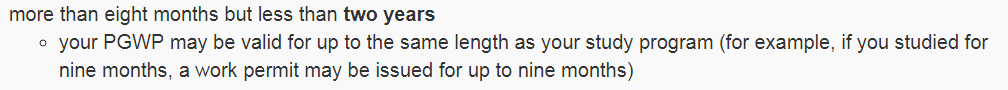 项目时间介于8个月至两年,PGWP可能与你实际就读该项目的时间一样长。即是,如果9个月完成项目,PGWP可能只有9个月而非固定1年。项目时间两年以上,通常为3年有效工签。