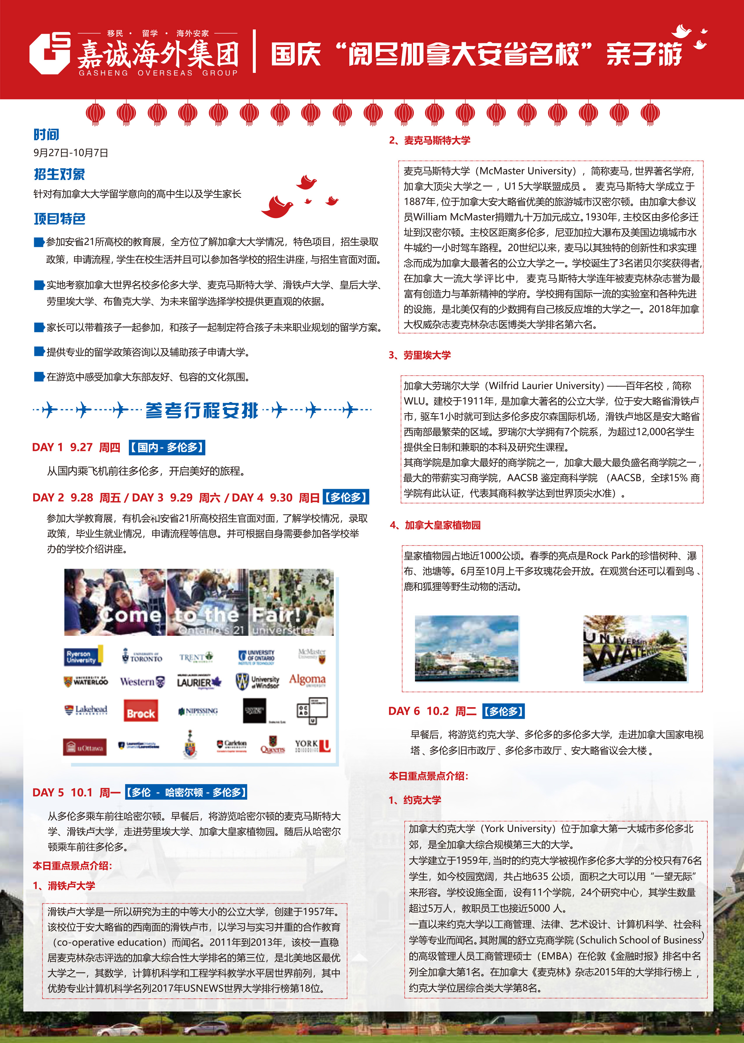 今年国庆,跟随我们的脚步,家长可以带着孩子一起去加拿大安大略省参加安省21所大学教育展,深度了解加拿大安大略省21所高校的学校信息,招生政策,专业设置,入学要求等。