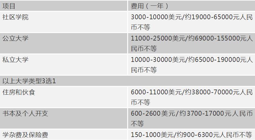无论去读哪种类型的学院,住房和伙食费用根据学校及其所在地区的不同,大约为每年6000-11000美元(约38000-70000元人民币)不等。书本及个人开支600-2600美元(约3700-17000元人民币)不等。
