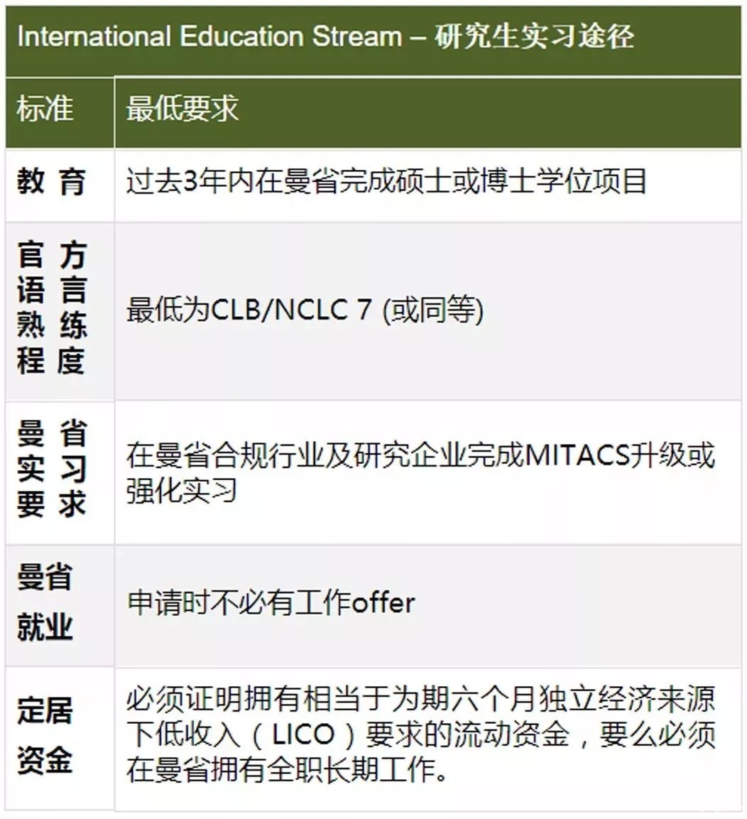 按照曼省政府2018年实行的针对留学生移民的新政要求,学生在曼尼托巴省内的大学或学院完成一个至少一年的学历课程(包括证书课程,大专课程,本科课程,研究生文凭课程以及硕博课程)后,除了硕博毕业生毕业可直接移民外,满足特定条件的留学生,只需要持有为期1年的雇主合同、职业符合曼省紧缺职业列表、无需工作经验即可申请移民!或者找到非紧缺工作且为雇主工作1年,并达到满足该工作需求的英语条件,亦可申请省提名。