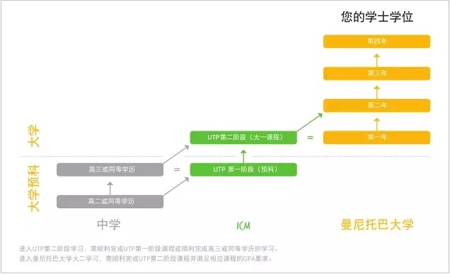 作为直接通向曼大的快捷通道,曼尼托巴国际学院一直和大学保持着良好的合作关系。学校提供大学桥梁课程UTP第一阶段,专为从中学过度到大学的国际学生而开设。顺利完成该课程并达到相应的要求,可升读ICM工程学、商科、理科或文科等专业UTP第二阶段。UTP第二阶段相当于曼尼托巴大学大一年级课程,顺利完成UTP第二阶段课程并达到相应的要求,可升读大学学位二年级课程。