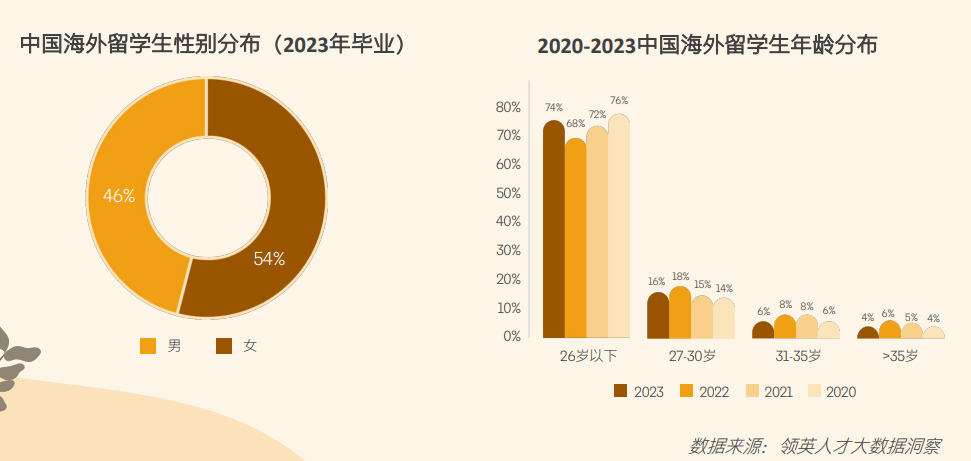 在去年海外华人留学生毕业群体中,女性以54%的占比略高于男性(46%)。