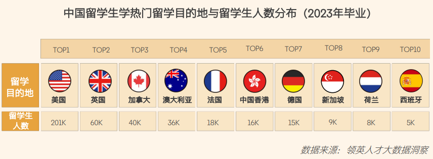 美国、英国、加拿大、澳大利亚依旧是中国留学生的选择主流目的地。