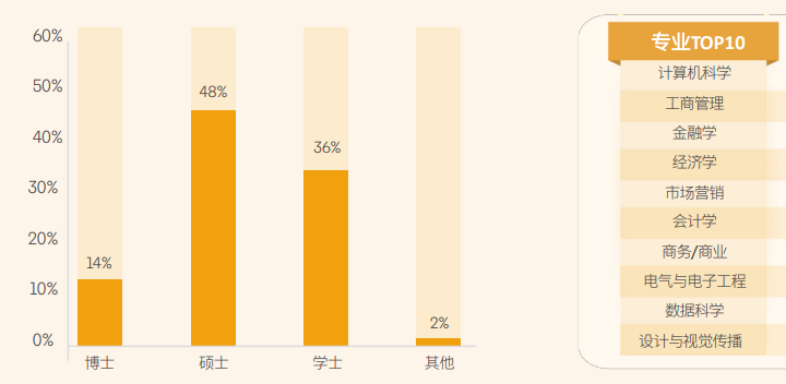 数据显示,2023年毕业的中国留学生中,硕士群体占比最高,占总人数的48%;其次为学士学位,占比36%;还有14%的学生攻读博士学位。