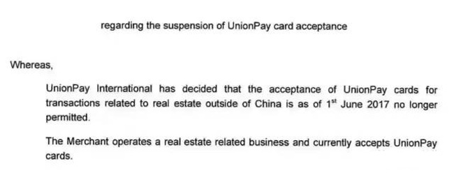 重磅消息!根据国际银联的正式书面通知,针对银联卡在中国境外进行的房产或投资类交易,将于2017年6月1日起正式关闭。