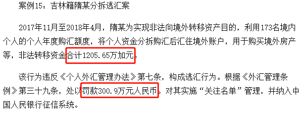 其中一宗个人违规分拆逃汇案,涉案人利用173名境内个人的个人年度购汇额度,非法转移资金高达1200多万加元,约合6000万元人民币,用于买房。通报称:2017年11月至2018年4月,隋某为实现非法向境外转移资产目的,利用173名境内个人的个人年度购汇额度,将个人资金分拆购汇后汇往境外账户,用于购买境外房产等,非法转移资金合计1205.65万加元。