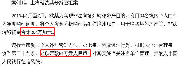 在该通报中,还有另一涉案人沈某,与这个隋某“同病相怜”。他涉及逃汇金额204万加元,也是用于购买境外房产等。涉案人被处以罚款51万元人民币。另外,沈某也被加入了“关注名单”,并纳入中国人民银行征信系统。