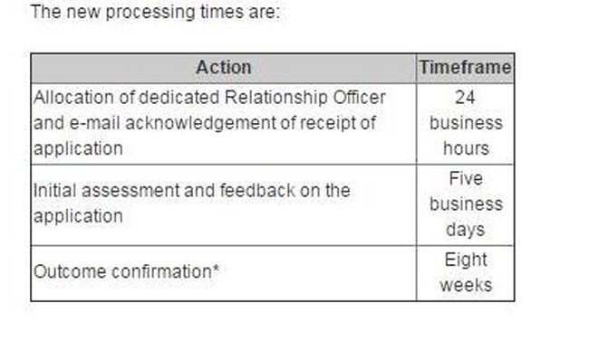 具体内容如下:递交材料之后的24个小时(工作小时)内,发出确认信并分配到相关专员。初级评估和反馈将在5个工作日内完成。在所有申请资料齐全的情况下,确认结果会在8周内给出。