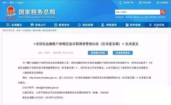 国家税务总局10月14日发布,就《非居民金融账户涉税信息尽职调查管理办法》(以下简称《管理办法》),向社会公开征求意见,意见截止到10月28日。备受瞩目的境外账户披露以及金融账户信息交换的具体办法浮出水面。消息报道,国家税务总局2017年1月1日开查境外账户,600万划线高低值,稽核补罚《办法》出台。