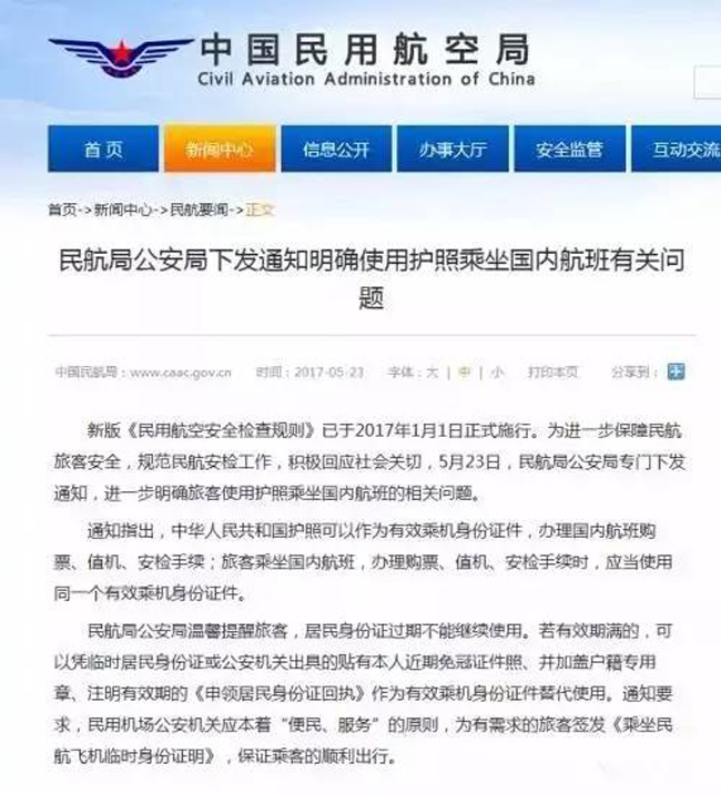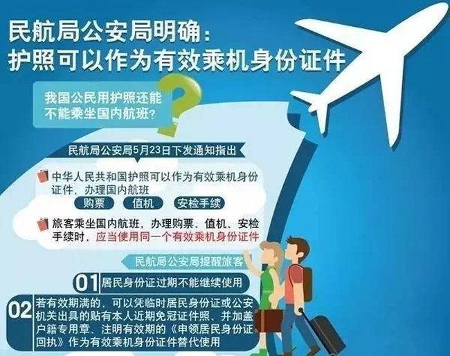 5月23日,中国民航局公安局正式下发通知:中华人民共和国护照可以作为有效乘机身份证件,办理国内航班购票、值机、安检手续;旅客乘坐中国国内航班,办理购票、值机、安检手续时,应当使用同一个有效乘机身份证件。