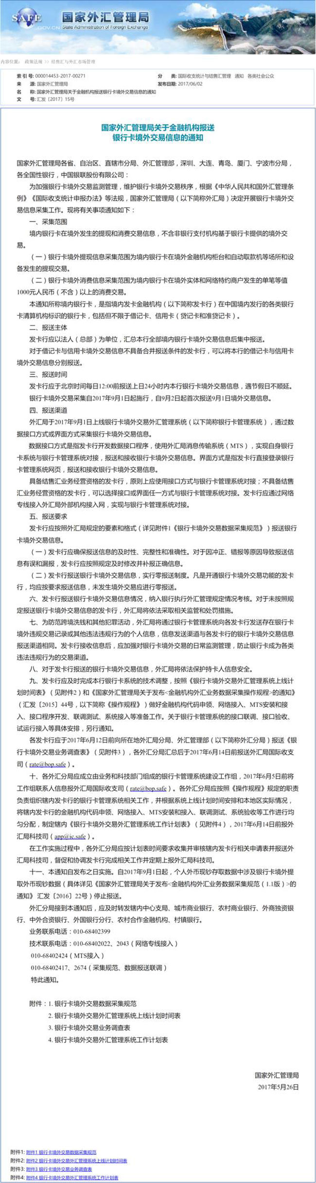 北京时间6月2日,中国外汇局发布《国家外汇管理局关于金融机构报送银行卡境外交易信息的通知》,规定自2017年9月1日起,中国境内发行的各类银行卡,如果在境外消费刷卡超过人民币1000元,发卡行要上报。