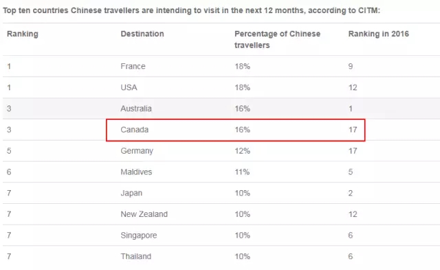 这份榜单显示,中国游客对加拿大的喜欢程度激增。
