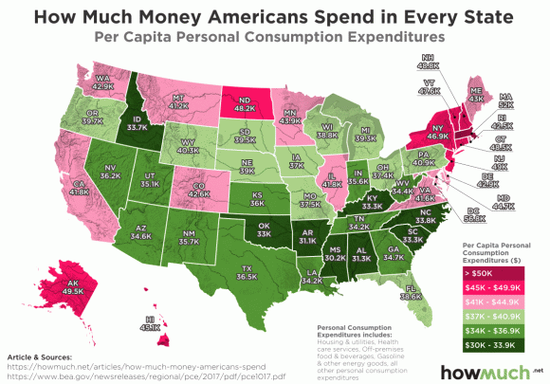 日前,美国HowMuch.net网站公布了一组由美国商务部下属的经济分析局(Bureau of Economic Analysis)于2017年10月发布的最新数据。这组数据列出了美国各州的个人消费水平,包括住房、交通、公用事业(水电气等费用)、医疗保健和食品用餐等方面的开销。该网站根据这组数据,按照颜色来进行编码。如大家所见,绿色州相对便宜,红色则相对较贵,大概是以年消费4万美金作为分水岭,超过4万美金就被归入“贵”的行列。网站文章同时指出,在了解这组数据时,不能只是以绿色和红色来判断在每个州的生活消费水平的高低,还能从中窥见各州的经济水平。