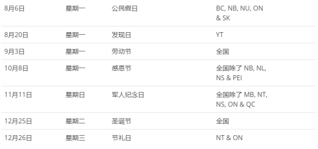 公民日:也普遍被当做8月长周末。高速公路会相当繁忙,大家都会外出游玩,露营,住小木屋等等。这个节日在不同的地方也会有不同的名字,比如MB省叫Terry Fox Day;BC省叫Columbia Day;多伦多叫Simcoe Day(安大略省其它地方并不这么叫);渥太华叫Colonel By Day等等。