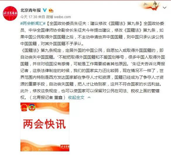 在今年的两会上,全国政协委员、中华全国律师协会副会长朱征夫再次在会上提出建议修改《国籍法》第九条,消息一出,立刻得到海外华人的关注。他建议,如果中国公民取得外国国籍之后,不主动申请放弃中国国籍,则中国只承认该公民中国国籍,对其外国国籍不予承认。