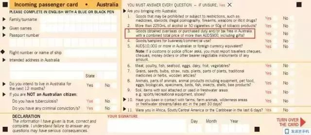 澳洲政府明确规定,如果旅客在离境时通过“游客退税计划”领取GST,且商品价值超过旅客免税许可金额900澳元(如果是18岁以下的未成年人,则许可金额为450澳元),在返回澳洲的时候,必须在入境乘客卡(IPC)申报这些商品!