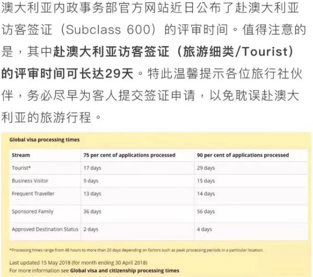 据悉,该审核时间并不是针对中国游客,澳洲针对全球的签证审核周期,90%的申请人审核周期最长可达29天左右,75%的申请人是在17天左右。