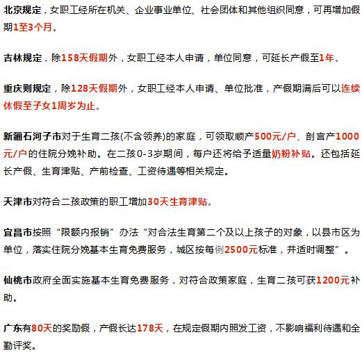自2017年以来,北京、广东、吉林、新疆石河子市、天津市、湖北省宜昌市、仙桃市等地相继出台了鼓励生二孩的福利政策。