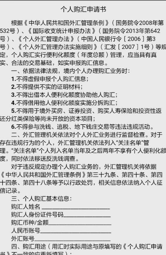 可以说,事无巨细,涉及到外汇都要上报。注意:在个人购汇申请书中,也明确了购汇“六不得”——不得虚假申报个人购汇信息;不得提供不实的证明材料;不得出借本人便利化额度协助他人购汇;不得借用他人便利化额度实施分拆购汇;不得用于境外买房、证券投资、购买人寿保险和投资性返还分红类保险等尚未开放的资本项目;不得参与洗钱、逃税、地下钱庄交易等违法违规活动。