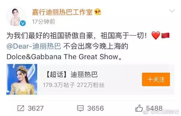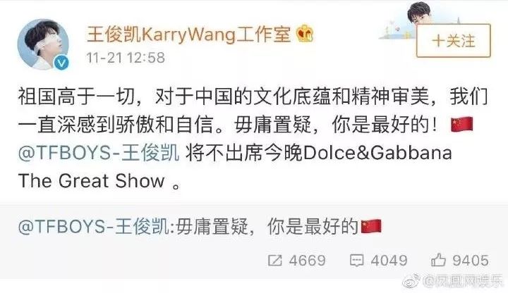 在国际化的今天,还用如此不避嫌的方式表示文化差异,这迅速在社交媒体上炸开了锅。针对DG设计师的言论涉嫌辱华,陈坤、章子怡、黄晓明、李冰冰、王俊凯、迪丽热巴等明星纷纷表示不会出席原定于11月21日晚的大秀活动,不少中国模特也宣布罢演。