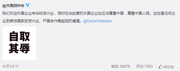 连共青团中央都直批:外国企业应当尊重中国,尊重中国人民,不然就是——自取其辱!