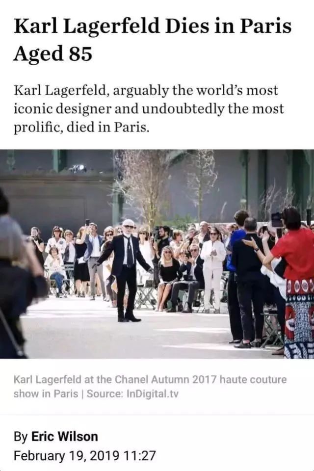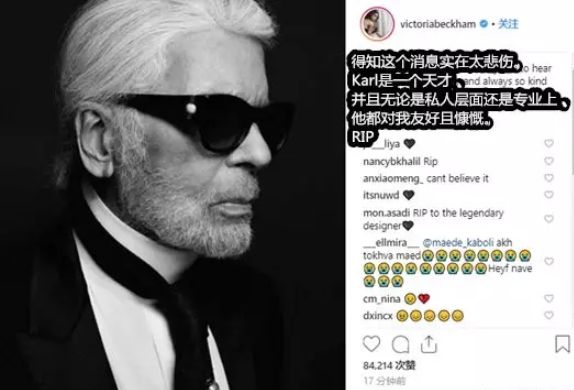 老佛爷去世的消息震惊了各大媒体,贝克汉姆妻子维多利亚,还有周迅、刘雯等中国明星和模特纷纷发文悼念。