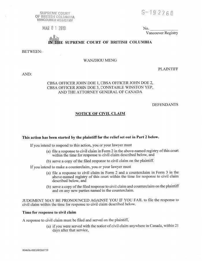 代表孟晚舟的律师事务所周日发表声明称,已于3月1日将一份民事索赔通知提交给卑诗省最高法院。根据诉状,边境局官员在逮捕孟晚舟时,假装执行常规边检,但突然违法限制她的人身自由,并在逮捕她之前进行搜查和审讯以寻找证据,这严重违法了加拿大宪法。