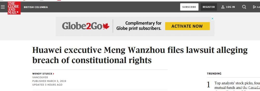 据环球邮报消息,孟晚舟将加拿大联邦政府、加拿大边境事务局以及加拿大皇家骑警告上法庭,直指他们在12月1日对其实施逮捕时严重违反了她的宪法权利。