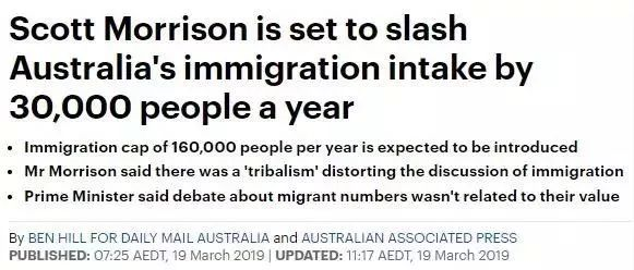 然而,当地时间3月19日,澳洲总理莫里森官宣:首次对移民份额修改设定限制,削减3万人,下一财政年的移民份额仅有16万!新的配额指标将从今年7月开始执行。