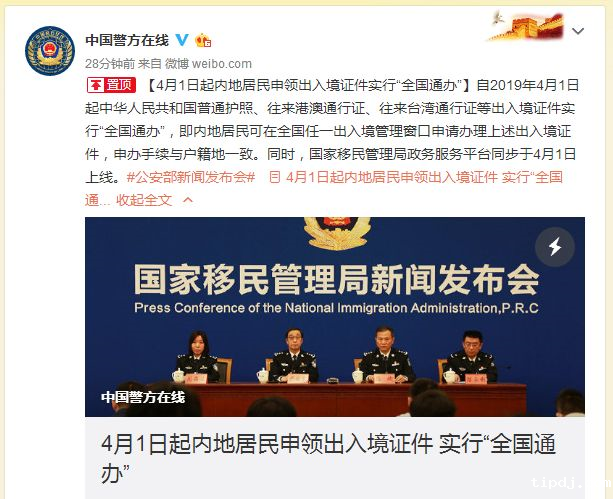 昨天上午,国家移民管理局在新闻发布会上宣布:自2019年4月1日起中华人民共和国普通护照、往来港澳通行证、往来台湾通行证等出入境证件实行“全国通办”,即内地居民可在全国任一出入境管理窗口申请办理上述出入境证件,申办手续与户籍地一致。